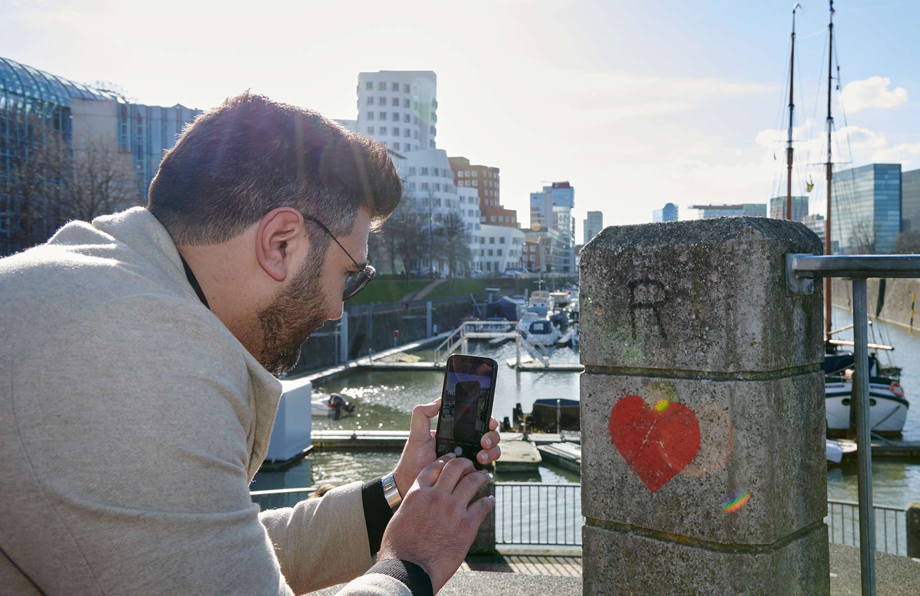 Diese Geschichte ging Hamzi Ismail sehr ans Herz und zeigt, mit wieviel Liebe und Empathi er immer an die Rätselauflösung geht. Ein bislang nicht gelüftetes Geheimnis, hinter dem die Reporterspürnase auch eine Herzensgeschichte vermutet, begegnet sogar uns bei unserem gemeinsamen Spaziergang an der Rheinpromenade. Hamzi deutet auf ein aufgesprühtes, rotes Herz auf einem Stein und sagt: „Davon gibt es mehrere in Düsseldorf, zum Teil auf dem Boden oder auf Objekten. Sie sind mit Sicherheit keinem Graffitikünstler zuzuordnen, denn die hinterlassen ja bei jedem ihrer Werke ihr Signet. Meine Aufrufe über Facebook, worüber ich oft hilfreiche Tipps bekomme, waren bisher erfolglos. Wenn also einer der Leser der NiederRhein Edition etwas weiß, bitte melden!“