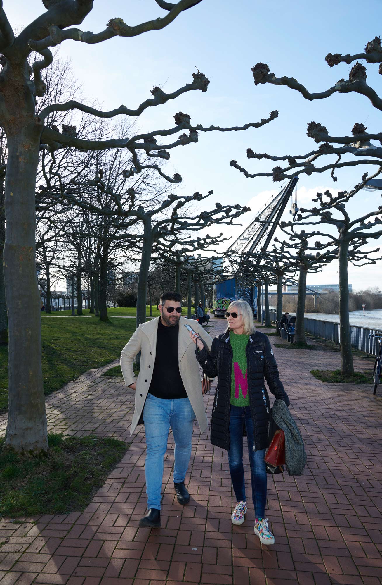 Mit flottem Schritt und wehendem, beigen Mantel kommt Hamzi Ismail die Treppe aus der ersten Etage des Funkhauses hinunter, wo er gerade noch in der Vertonung saß für eine Dokumentation des neuen WDR-Youtube-Formats „MordOrte“, das echte Kriminalfälle aus NRW behandelt. Sofort hat er uns in der Cafeteria wahrgenommen. Die Begrüßung ist herzlich, und wir freuen uns auf zwei Stunden mit einem entspannten, sympathischen und unkomplizierten Zeitgenossen. Auf dem Weg zum Shooting vor den stylischen Gehry-Bauten im Medienhafen erleben wir Hamzi, den wir ab sofort duzen dürfen, als telegenen Mann, der es jedem Fotografen leicht macht: Der weiß, wie man am besten vor der Linse rüberkommt. Der sich aber auch freut, wenn man für ein noch besseres Bild an seinem Mantel oder seinem Schal zubbelt. Bei unserem Spaziergang an der Rheinuferpromenade, die er, wie er zugibt „viel zu selten privat“ genießt, erfahren wir, dass Hamzi Ismail das jüngste von sechs Geschwistern ist. Er hat noch vier Schwestern und einen Bruder und bezeichnet sich schmunzelnd als „Nesthäkchen“.