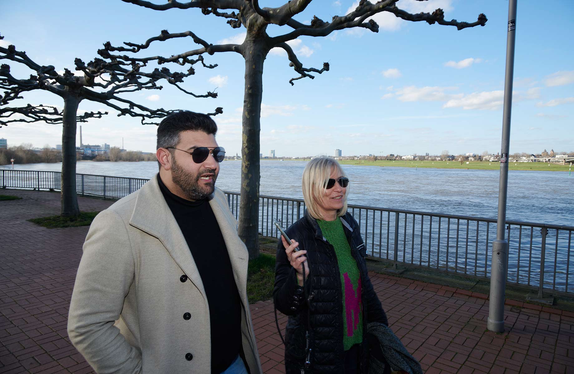 Einen ganz eigenen „Aha-Effekt“ konnten wir übrigens unserem Promi beim Trip am Rheinufer bescheren. Wir haben ihn mit auf den Fernsehturm genommen, der in diesem Jahr 40. Geburtstag feiert. Aus 168 Metern Höhe hatte Hamzi buchstäblich den Überblick, den er für seine Arbeit braucht. „Hier war ich noch nie“, musste unser Gast zugeben und war begeistert von der Rundum-Fernsicht über sein Schaffensreich zwischen Neuss und Grevenbroich, Dormagen und Kempen, Krefeld und Viersen. An einer der riesigen schrägen Fensterscheiben nutzte Hamzi die Gelegenheit für ein Instagram-Video, natürlich mutig „schwebend“ über dem WDR Funkhaus und dem Medienhafen.