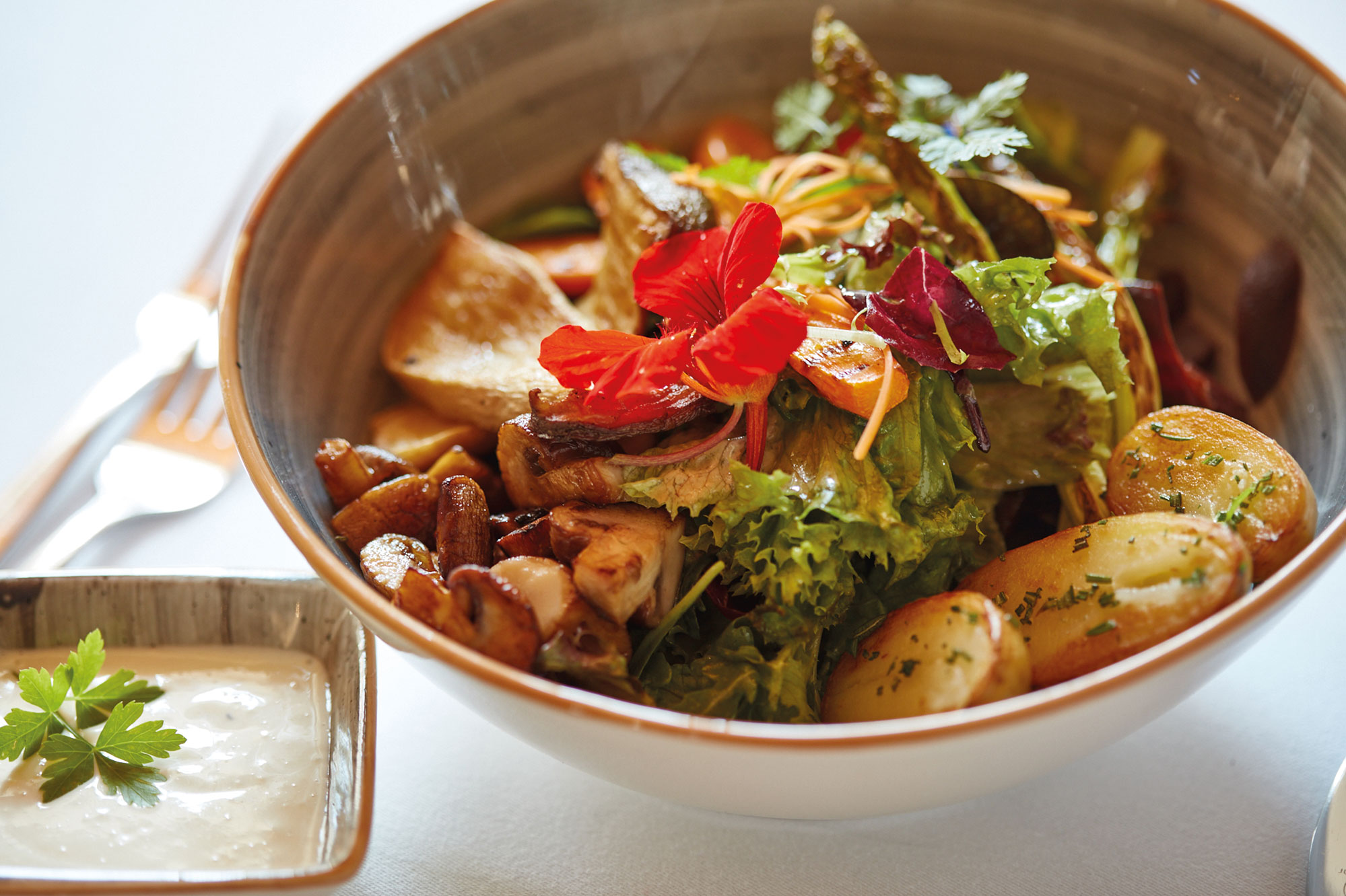 In dem Landgasthof, 1456 als Getreidemühle erstmals in den Grenzland-Chroniken erwähnt und seit 121 Jahren Gaststätte, kommt nun knackiges Grün in die Schale. Als der Müller 1954 die Hausmühle der Ritter derer von Bocholtz stilllegte, hieß solch ein Arrangement noch Salat. Heute serviert die Lü-Cuisine die Gesundkost waldschratig wie das umliegende Naturparkparadies: Wilde Hilde. Mit Wildkräutern, gebratenen Pilzen, Karotte, grünem Spargel, Rote Bete und Drillinge. Aber auch trendy mit einem Mix aus urbanem Flair und Dachterrassen-Lounge: Querbeet. Mit Avocado, Brokkoli, Karotte, Granatapfelkernen und Kichererbsen. Beides ist bissfest-lecker! Auf Empfehlung des Hauses werden wahlweise Falafel, Ziegenkäse, Chorizo, Garnelenspieß, Hähnchenbrust und Knoblauch-Dip kredenzt.