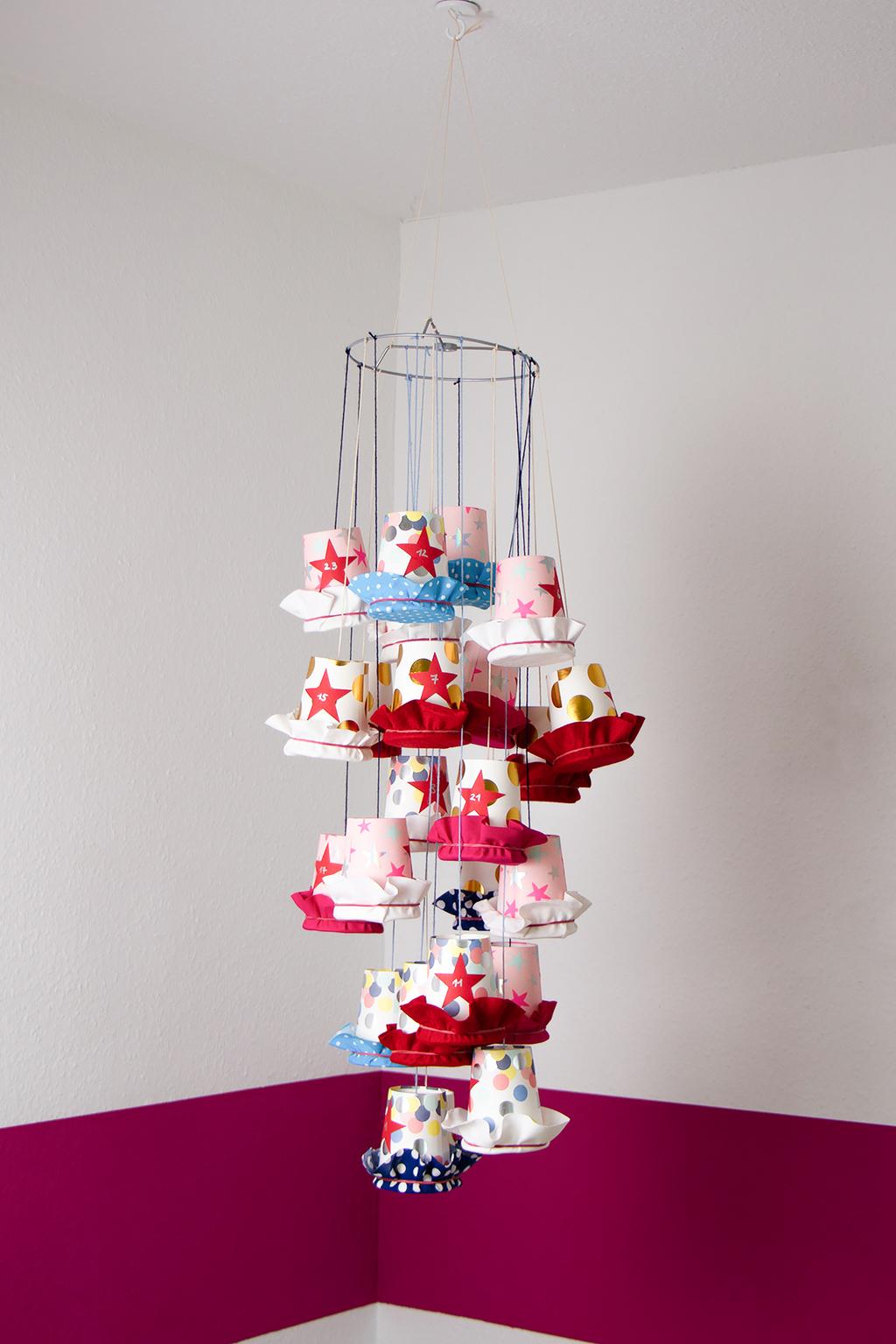 Jetzt können die Becher auch schon mit kleinen Geschenken befüllt werden. Dann die die Stoffkreise auf die Öffnung legen und mit einem Haushaltsgummi fixieren. Nun die Becher in unterschiedlichen Längen, wie im Bild an einen Lampenring geknotet werden. Alternativ bietet sich auch eine Gardinen oder Vorhangstange an.