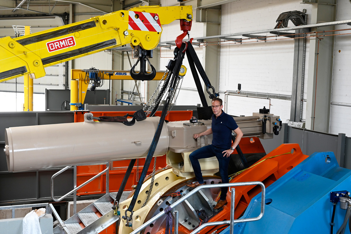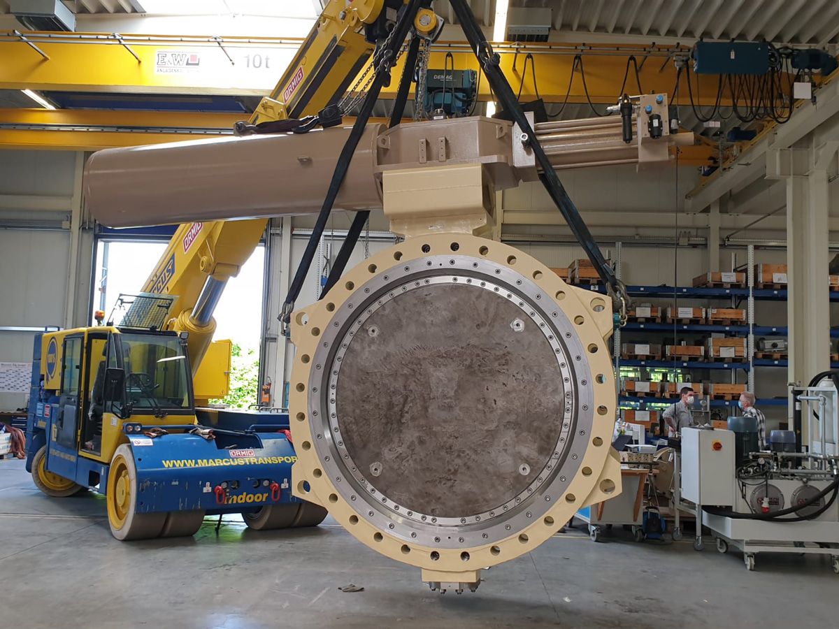 Bei der Regel- und Absperrklappe mit einer Nennweite 80“ (ø 2000mm) handelt es sich um eine der größten Stellgeräte der Welt. Eingesetzt werden solche metallisch dichtenden Klappen beispielsweise in industriellen Anwendungen im Öl- und Gas-Bereich, in Raffinerien, in der chemischen Industrie, in Meerwasser-Entsalzungsanlagen, in der Gasgewinnung, im Kraftwerksbau sowie im Schiffsbau. Obwohl LEUSCH seit 47 Jahren auf die Entwicklung, Konstruktion, Bearbeitung und Produktion derartiger dreifach exzentrischer Klappen spezialisiert ist, stand bei dem jetzigen Manöver bei vielen Mitarbeitenden in der Montagehalle der Atem still. Hydraulischer Schwenkarm, Gurte, Ketten und Karabiner leisteten ganze Arbeit. „Dreifach exzentrisch“ bedeutet, dass es in der Klappen-Konstruktion keine Übergänge zwischen Scheibe und Welle gibt, wodurch eine hohe Dichtheit ermöglicht wird.