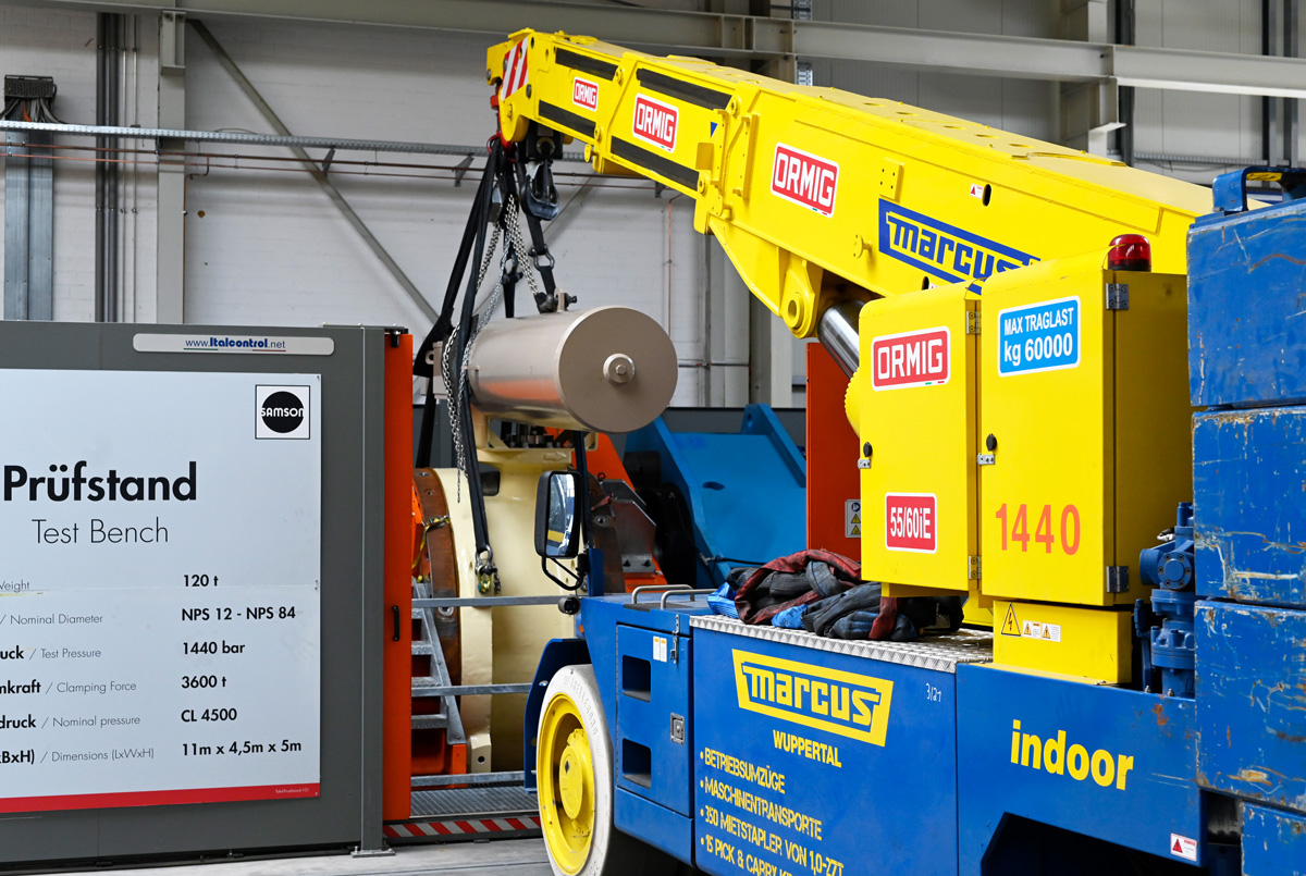 Eine echte Herkulesaufgabe hat der Neusser Industriearmaturen-Hersteller SAMSON LEUSCH dieser Tage bewältigt: Eine 21 Tonnen schwere Absperrklappe musste vom Produktionsstandort im Werk an der Ziegeleistraße 10 in den betriebseigenen Prüfstand manövriert werden. „Wir haben hierfür eigens einen Kranwagen einer Spezialfirma mit 60 Tonnen Traglast angemietet, der die Armatur in Millimeterarbeit in den Prüfstand bewegt hat“, berichtet LEUSCH-Geschäftsführer Marcus Miertz. Das 1974 gegründete Unternehmen vom Niederrhein gehört seit 2003 zu SAMSON, einem der weltweit führenden Hersteller hochwertiger Stellventile.