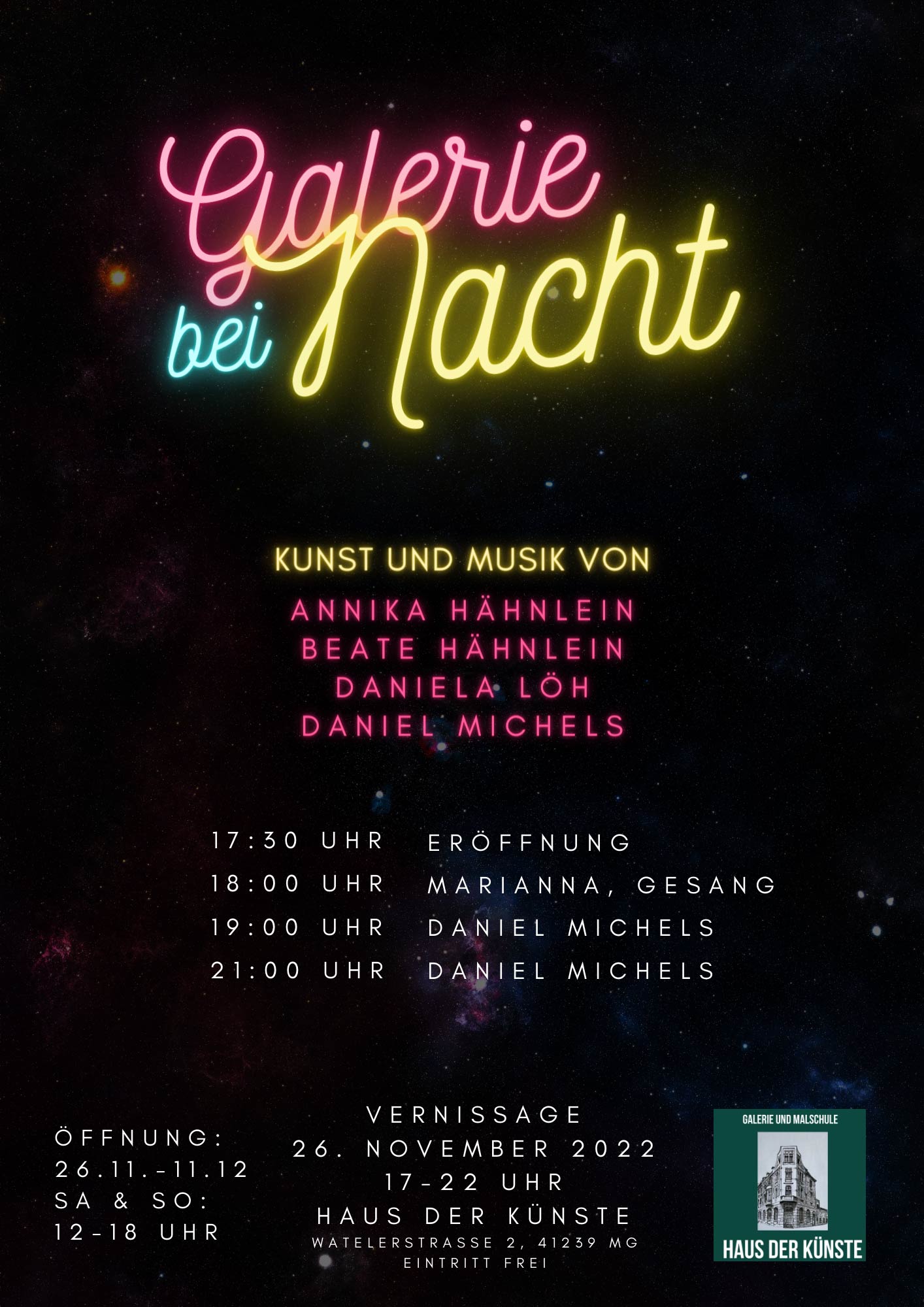 Am 26. November, dem ersten Adventswochenende, wird die neue Ausstellung »Galerie bei Nacht« im Haus der Künste eröffnet und steht Besuchern bis zum 11. Dezember offen. Neben der Mitbegründerin des Haus der Künste, Daniela Löh, stellen die beiden Künstlerinnen Annika Hähnlein und Beate Hähnlein ausgewählte Werke aus. Musikalisch wird Daniel Michels den Abend begleiten, zudem gibt es eine Überraschungskünstlerin aus dem klassischen Bereich. Thematisch setzen sich die drei Malerinnen mit unterschiedlichen gesellschaftskritischen Themen auseinander, hier ist für jeden was dabei.