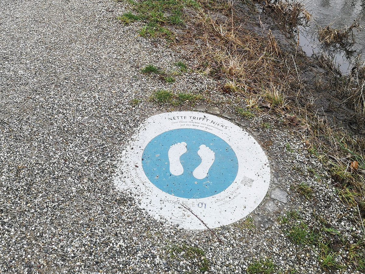 „Kennt ihr die Niers-Fähre?“, fragt Claus, und sitzt schon wieder im Sattel. Nach Norden, ein Stück die Wankumer Straße entlang, dann nach 300 Metern links ins Feld. Nach ein paar Minuten stehen wir auf einer Edelstahlplatte. Auf der steht „Nette trifft Niers“. Der Naturpark Schwalm-Nette hat im Zuge eines Wettbewerbs vor zehn Jahren diese Perspektive als „Wasserblick“ auserkoren. „An dieser Stelle machen sich die zwei Wachtendonker Flüsse gemeinsam auf den Weg zur Maas“, berichtet Michael Puschmann, Geschäftsführer beim Naturpark Schwalm-Nette.