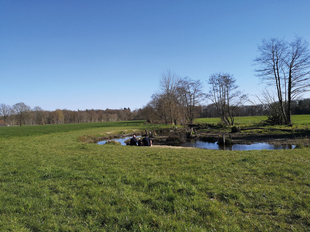 Wir erfahren, dass der Netteverband den Fluss an dieser Stelle auf 450 Metern naturnah umgestaltet hat. Ziel ist, dass künftig wieder mehr Tiere und Pflanzen im Fluss leben. Deshalb werden die in der Vergangenheit naturfern ausgebauten Gewässerabschnitte jetzt peu à peu wieder zurückentwickelt. Ja, dieser Nette-Swing inspiriert uns. Besonders die Wurzelstubben mitten im Wasser.