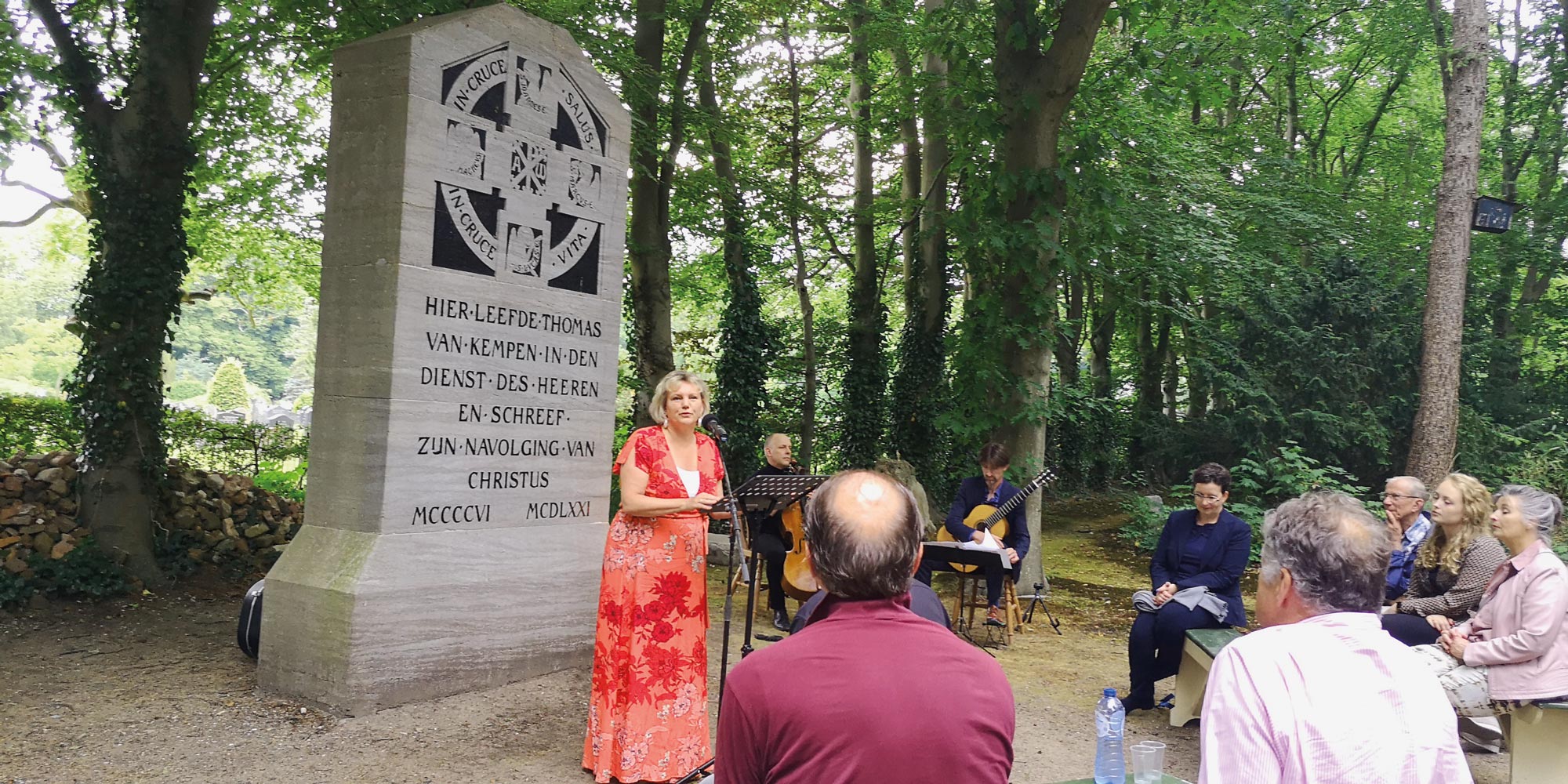 Entsprechend groß ist nach einer kontemplativen Dreiviertelstunde der Applaus für allgemeingültige Weisheiten aus berufenem Munde, die ein Gelehrter vom Niederrhein vor 600 Jahren in seiner Kloster-Kemante mit Federkiel und Tinte zu Papier brachte und damit die Werte des Humanismus, der Mitmenschlichkeit, der Versöhnung und der Zuversicht in verständliche Sprache packte. Da ist beispielsweise der Thomas-Spruch „Een goed devoot mens, regelt eerst innerlijk de bezigheden, die hij uiterlijk moet gaan verrichten“, den die Stichting als Überschrift ihres Prospektes ausgewählt hat. Auf Deutsch klingt das etwa so: „Ein guter gläubiger Mensch ordnet zunächst einmal innerlich die Tätigkeiten, die er äußerlich zu verrichten hat.“ Dazu passen bei der heiteren Stunde am Thomas-Stein die meist romantischen Stücke des Musikerduos Jeroen van Dijk (Cello) und Rik Hasselman (Gitarre), die Werke von Burgmüller, Zaragoza, Bach und Máximo Pujol zu Gehör bringen. Die hohen Eichen, Buchen, Linden und Ahornbäume hallen aus dem Blattwerk die Worte und das Klangspiel mit natürlicher Kraft wider. „Oprechte dank“, sagt Jan Bijlsma im Dämmerlicht der Blauen Stunde zu Monique, Jeroen und Rik nach so viel einfühlsamer Kulturvermittlung im Sinne von Thomas. Der pensionierte Pädagoge ist Vorsitzender der Stichting und sich nicht zu schade, mit einem Häuflein Helfern nach der Sommerserenade die Stühle und Bänke wieder ins Friedhofsdepot zu tragen. Als Philosophie- und Ethiklehrer im Ruhestand ist das Thomas-Gedankengut Jan Bijlsma sehr vertraut.