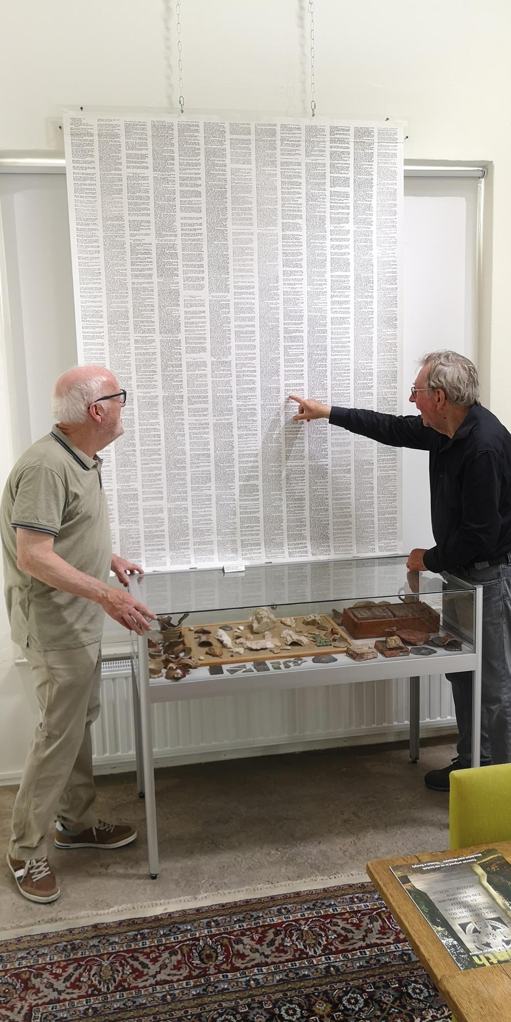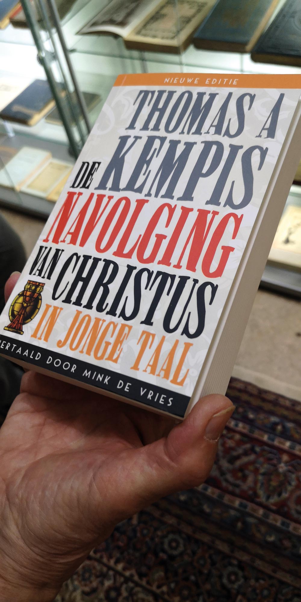 Madzy van der Plaats vom Vorstand der Thomas-Vereinigung zeigt beim Rundgang durch das Museum die zeitgenössische Übersetzung der „Imitatio Christi“ des Zwoller Dozenten Mink de Vries „Thomas a Kempis. De Navolging van Christus. In Jonge Taal“. „Diese Übersetzung kommt in den Niederlanden besonders bei der Jugend sehr gut an und macht die Menschen niederschwellig mit den Schriften des Thomas vertraut“, so die pensionierte Lehrerin.