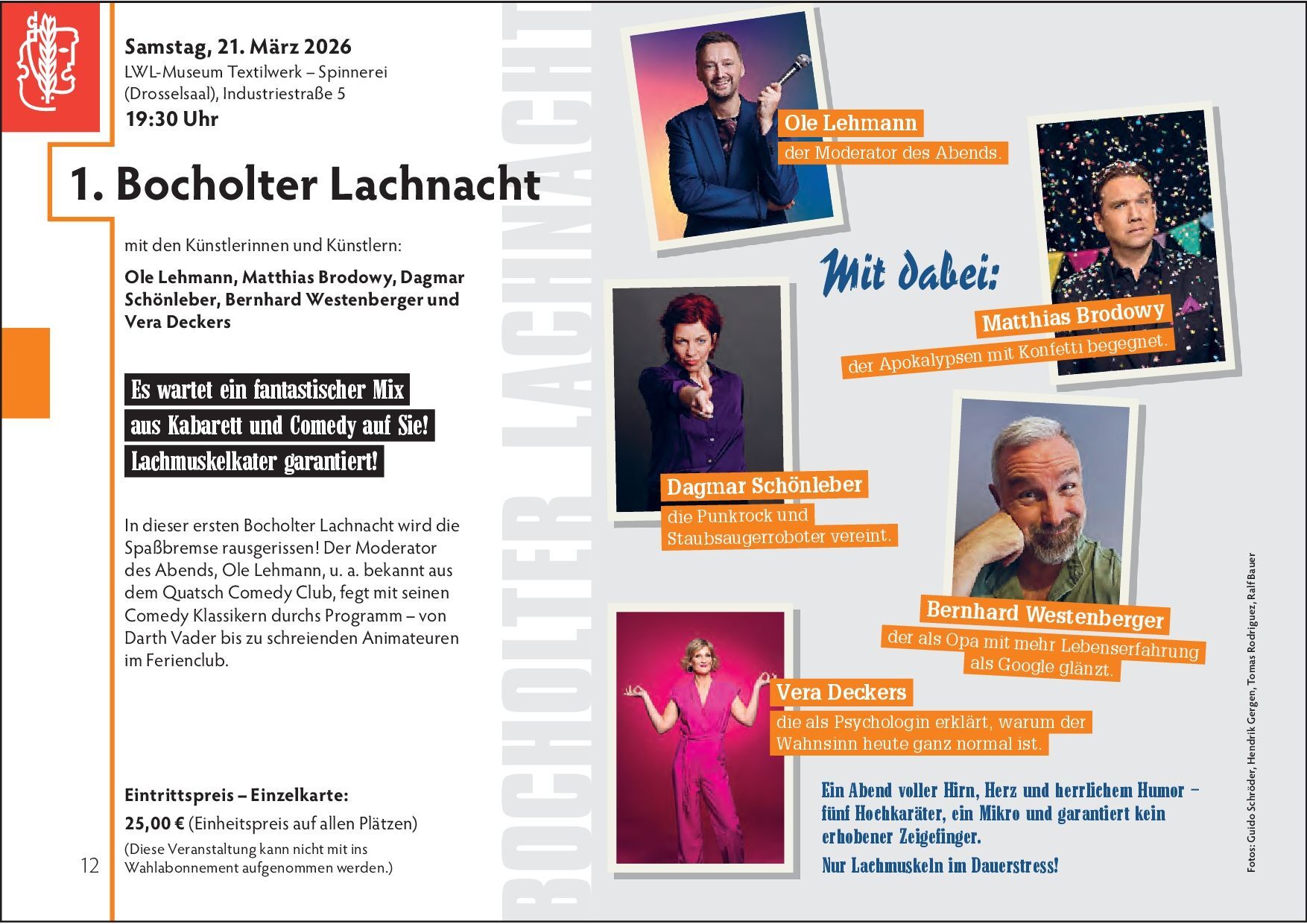 Die 1. Bocholter Lachnacht startet mit den Künstlerinnen und Künstlern Ole Lehmann, Matthias Brodowy, Dagmar Schönleber, Bernhard Westenberger Und Vera Deckers.