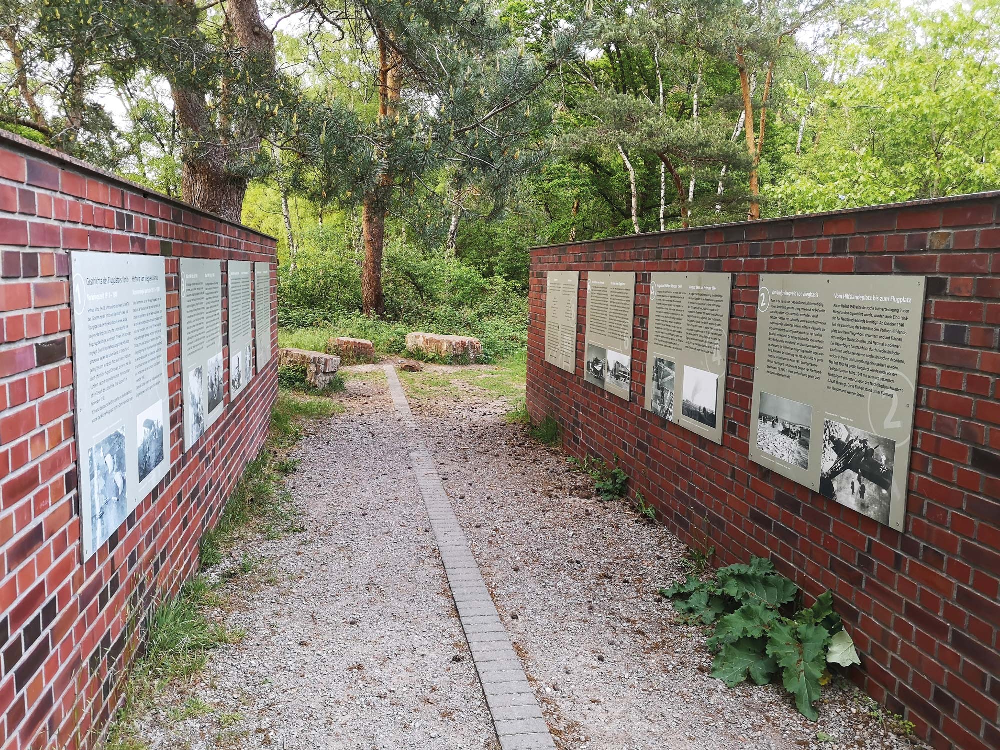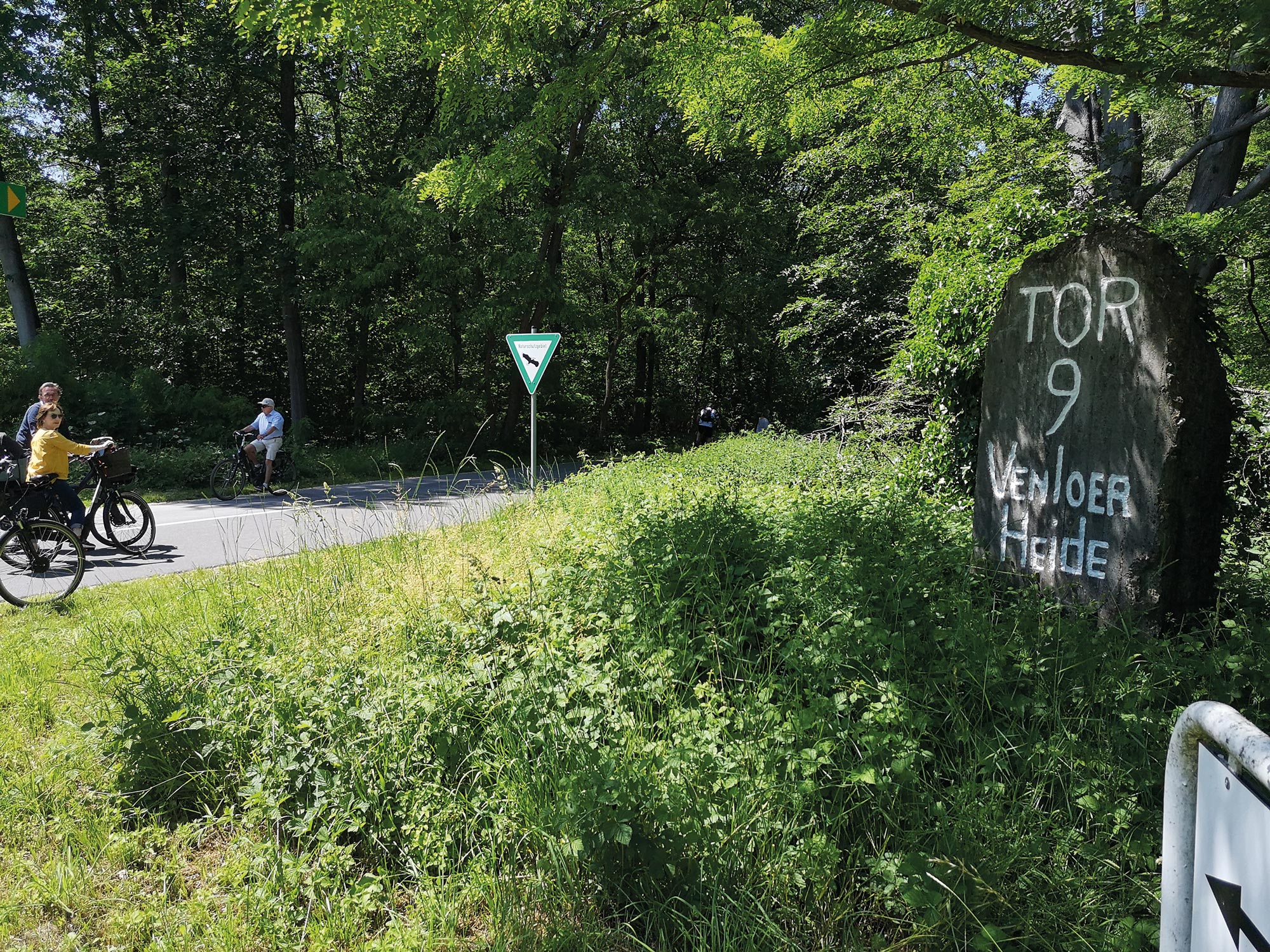 Sieben Kilometer pralle Natur, inspirierender Kulturlandschaften, geschichtsträchtigen Im-pressionen und pulsierendem Stadtleben in der Maas-Metropole warten auf uns zwei Mittelalter-Pärchen. Nach zwei Kilometern ab dem Parkplatz „Groote Heide” ragt auf dem schnurgeraden Asphaltweg linkerhand kaum erkennbar der frühere Schlagbaum aus dem Buschwerk heraus. Kurz dahinter folgt rechterhand die 2008 eingerichtete Gedenkstätte mit Infotafeln zum früheren Fliegerhorst Venlo. An dieser Stelle wurde am 3. Juni 1973 der Grüne Grenzübergang für Freizeitler geöffnet. Ab der Gedenkstätte sehen wir den ehemaligen Fliegerhorst bereits, der heute als Segelflugplatz genutzt wird.