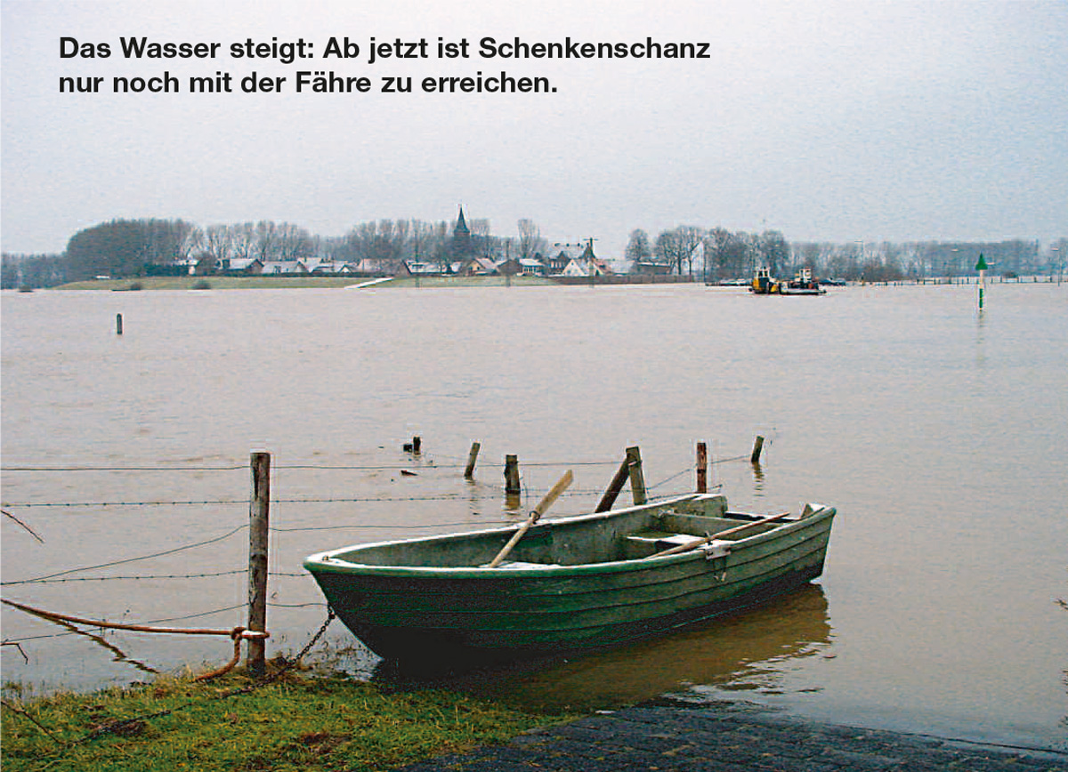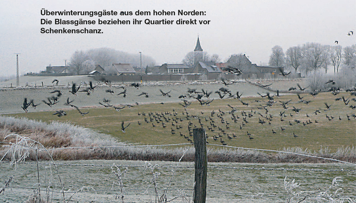 Wenn dann auch die Deichstraße im Wasser verschwindet, wird Schenkenschanz wieder zur Insel, so wie früher als Festung im Rhein. Dann kommt auch schon mal das Fernsehen und liefert beeindruckende Bilder von der „Hallig mitten am Niederrhein“, die zu ihrem Schutz zu zwei Drittel von einer Hochwasserschutzmauer umgeben ist. Der Rest wird durch einen Deich vor den Fluten geschützt. Sobald das Wasser sich zurückzieht und der Sommer beginnt, bevölkern viele Fahrradtouristen Schenkenschanz und das nahe gelegene Naturschutzgebiet Salmorth, um von den Wanderwegen aus eine große und interessante Population seltener Vogelarten zu beobachten. Ab Oktober, wenn das Wasser sinkt, bietet dieser Ort am Niederrhein nicht nur Fachleuten und Naturfreunden ein beeindruckendes saisonales Schauspiel. Denn dann reisen Zehntausende halbwilde Höckerschwäne und Graugänse aus dem hohen Norden schnatternd an und verdunkeln den Himmel. Sie kommen, um hier in den niederrheinischen Wiesen und Weiden zu überwintern. Wenn dann die Reisebusse mit den fernglasbehängten Naturfreunden in Schenkenschanz „einfallen“ und es den Gänsen gleichtun und ebenfalls schnatternd durch die Weiden spazieren – ja dann ist es mit der beschaulichen Ruhe in Schenkenschanz erst einmal wieder vorbei. Aber die rund 100 „Schänzer“, wie sich die Einwohner von Schenkenschanz selber bezeichnen, wissen sich zu arrangieren und würden „ihre Insel“ niemals freiwillig verlassen.