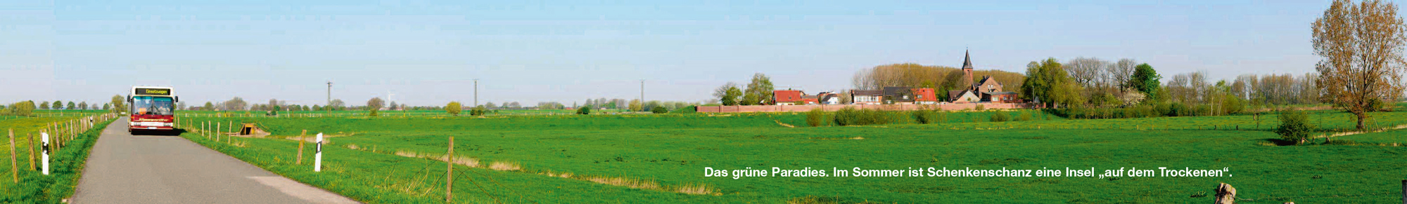 6 Grad, 6 Minuten, 40 Sekunden östlicher Länge und 51 Grad, 50 Minuten, 10 Sekunden nördlicher Breite. Dort, wo die Landschaft Natur pur ist, dort liegt Schenkenschanz, ein beschauliches Dorf am unteren Niederrhein und mit 38 ha der kleinste Ortsteil von Kleve. Die Graugänse aus dem hohen Norden haben dieses idyllische Fleckchen Erde für sich entdeckt und überwintern hier jedes Jahr aufs Neue. Denn das milde Klima in den Rheinauen und die Natur bieten den gefiederten Touristen ideale Aufenthaltsbedingungen. Wenn man dieses kleine Paradies mitten in der beschaulichen niederrheinischen Landschaft betrachtet, dann will man kaum glauben, welch bewegte Vergangenheit sich dahinter verbirgt. Und doch ist es wahr. Denn dieser Ort ist benannt nach Martin Schenk von Nideggen, dem Schrecken des Niederrheins.