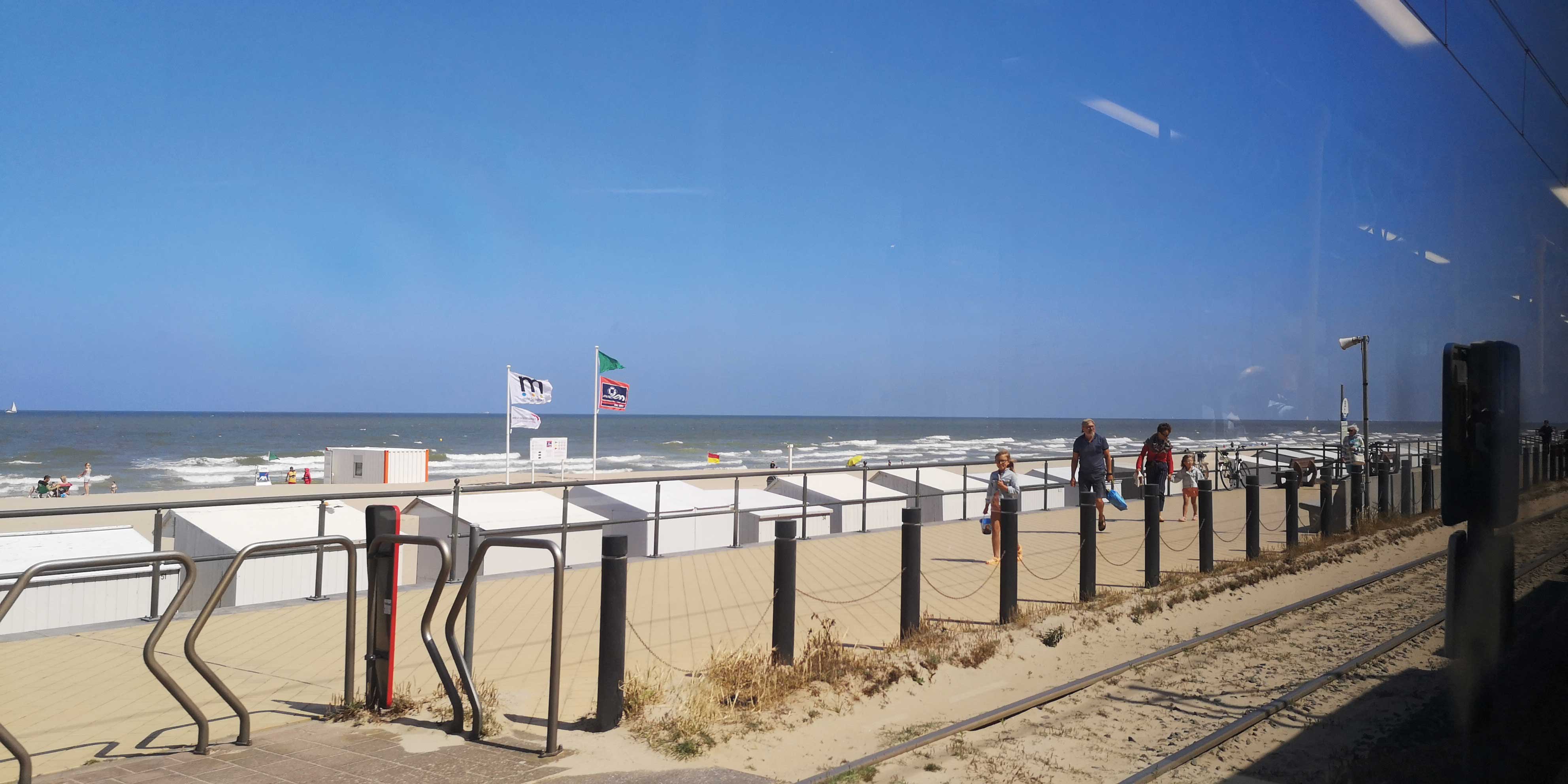 De Panne ist der westlichste Punkt Belgiens und auch der südlichste Badeort an der belgischen Küste. Die 11.000-Einwohner Gemeinde, wo vielfach schon das Französische eine Rolle spielt, haben wir in der Vergangenheit schon schätzen, ja lieben gelernt. Deshalb können wir jetzt ins Bähnle steigen, ohne das Gefühl zu haben, etwas verpasst zu haben. Die nächsten drei Stunden bestimmt die Kusttram auf ihrer zweispurigen sieben Meter breiten Trasse mit der elektrischen Oberleitung unser Leben. Wir setzen uns auf unserer Fahrt zum Endpunkt Knokke ganz nach hinten und auf die linke Seite in den klimatisierten Wagen, damit wir möglichst viel Meer sehen.