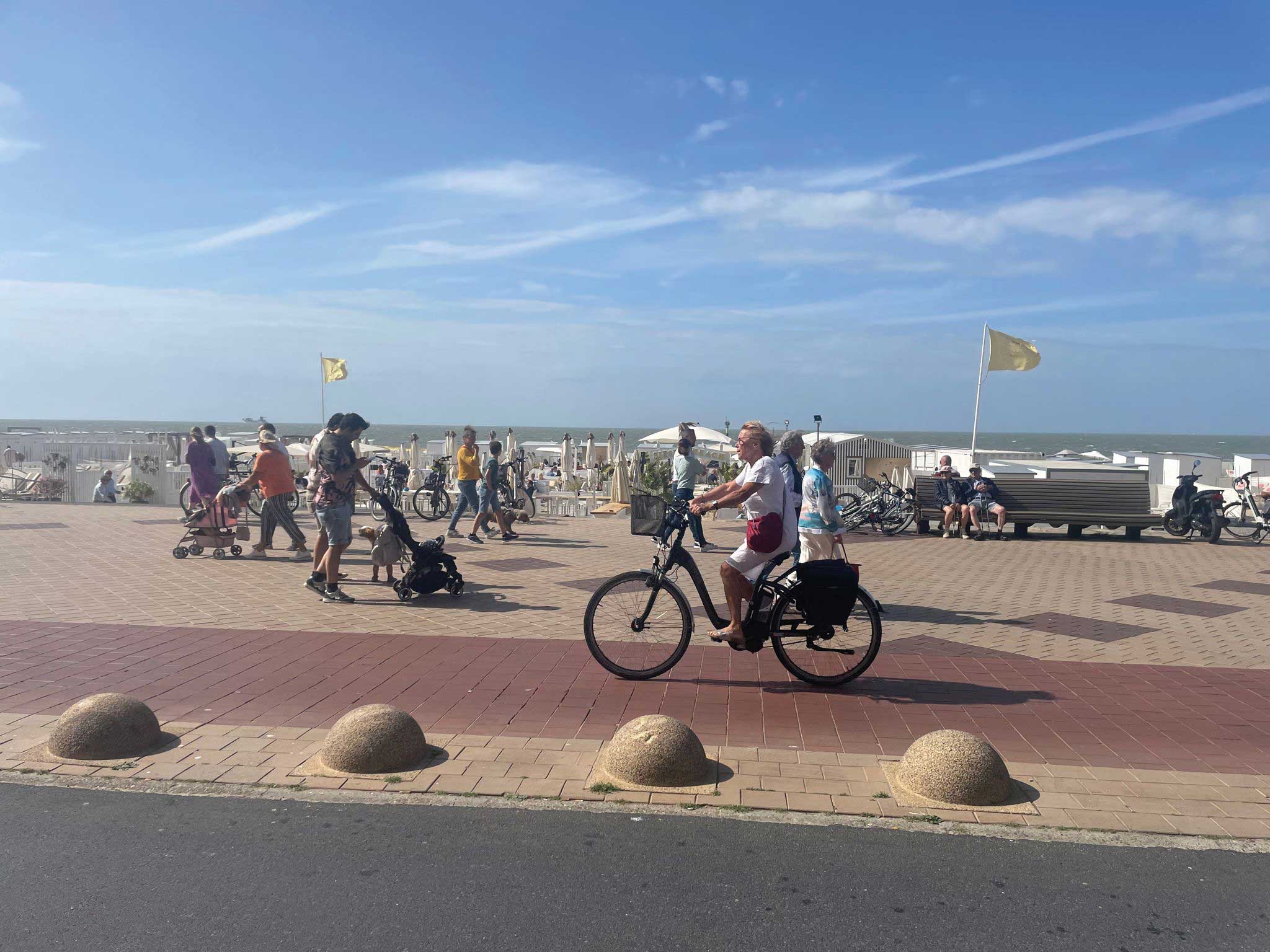 Doch Pustekuchen: Erst nach 53 Minuten eröffnet sich uns das Meer in seiner ganzen Schönheit. Und zwar hinter dem Halt De Greefplein bei Middelkerke. Hier liegt zwischen uns und dem Gestade nur die Promenade, wo Urlauber per Rad, Vespa, E-Scooter, Kettcar oder zu Fuß mit Kind, Kegel und Waldi das Strandparadies genießen.