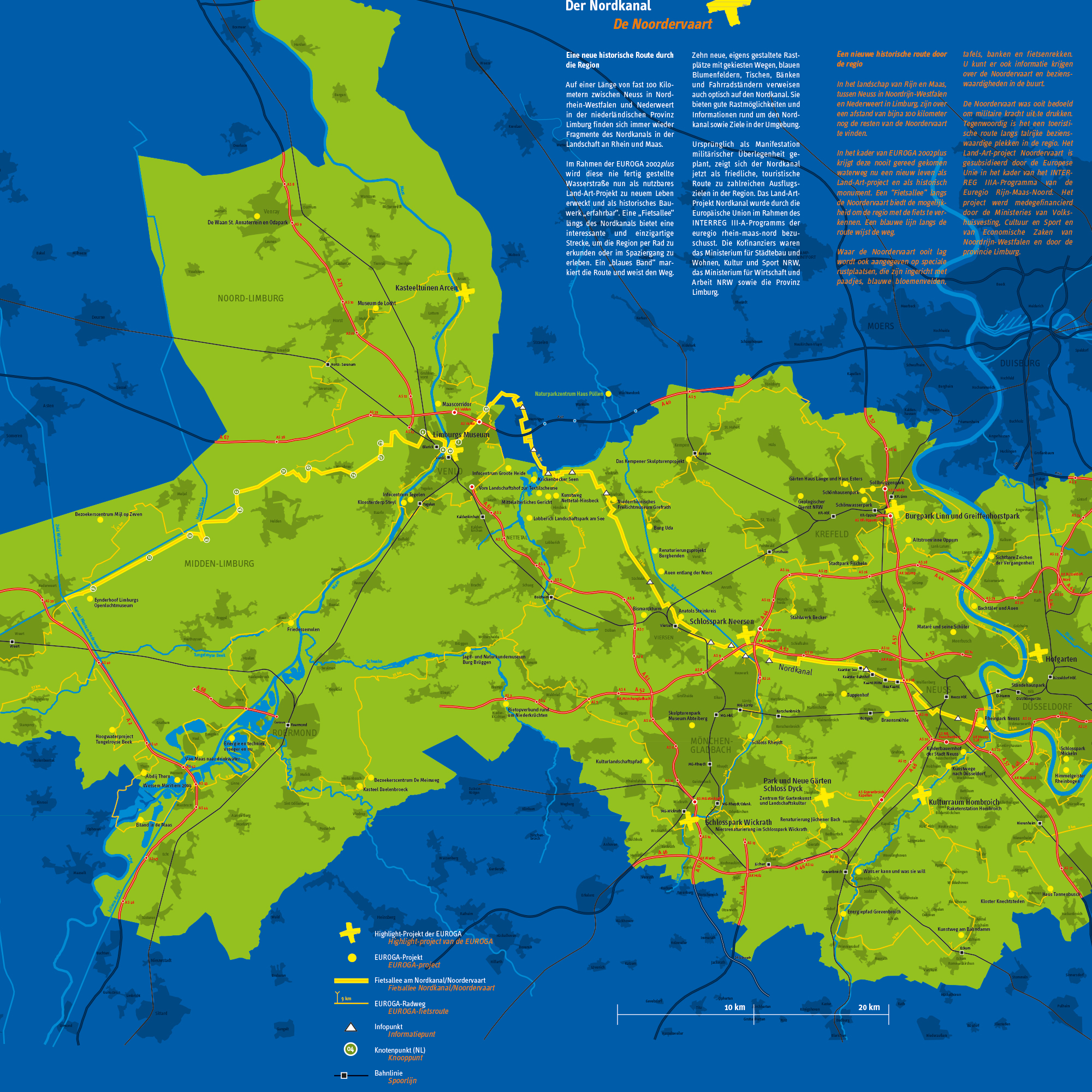 Die Geschichte des Nordkanals kann heute ideal mit dem Fahrrad erkundet werden. Zu verdanken ist das der Initiative des Arbeitskreises Nordkanal, die ihn im Rahmen der Euroga 2002plus neu in Szene gesetzt hat. Land-Art Projekt Fietsallee verbindet neue und alte Spuren rund um Napoleons Kanalprojekt und trägt damit der damaligen hohen Ingenieursleistung Rechnung. Als Bodenmarkierung, in Form von Stelen sowie als blaue Markierung an Laternenpfosten markiert ein blaues Band die Fietsallee zwischen Neuss und Nederweert. Abseits der Fahrradroute zeigen orange-weiß gestreifte Markierungsstangen, die an Vermessungsstangen erinnern, die geplante Trasse des Nordkanals. Blaue Fietsallee-Infotafeln halten Wissenswertes rund um den Kanal, Übersichtskarten mit Radrouten und Sehenswürdigkeiten für die Radfahrer bereit. Natürlich laden entlang der Strecke individuell gestaltete Rastplätze zur Pause ein. Eine Erlebnisbrücke zeigt, mit welchen Techniken Wasserstraßen früher überquert wurden. Baumreihen, blumengefüllte Nordkanalprofile und andere künstlerische Inszenierungen reihen sich entlang der Fietsallee. Die Fietsallee verbindet bis heute alle am Kanalbau beteiligten Ortschaften miteinander. Auf deutscher Seite sind es Neuss, Kaarst, Korschenbroich, Willich, Mönchengladbach, Viersen, Grefrath, Nettetal und Straelen. In den Niederlanden führt der Nordkanal über Venlo Maasbree, Helden und Meijel bis nach Nederweert.