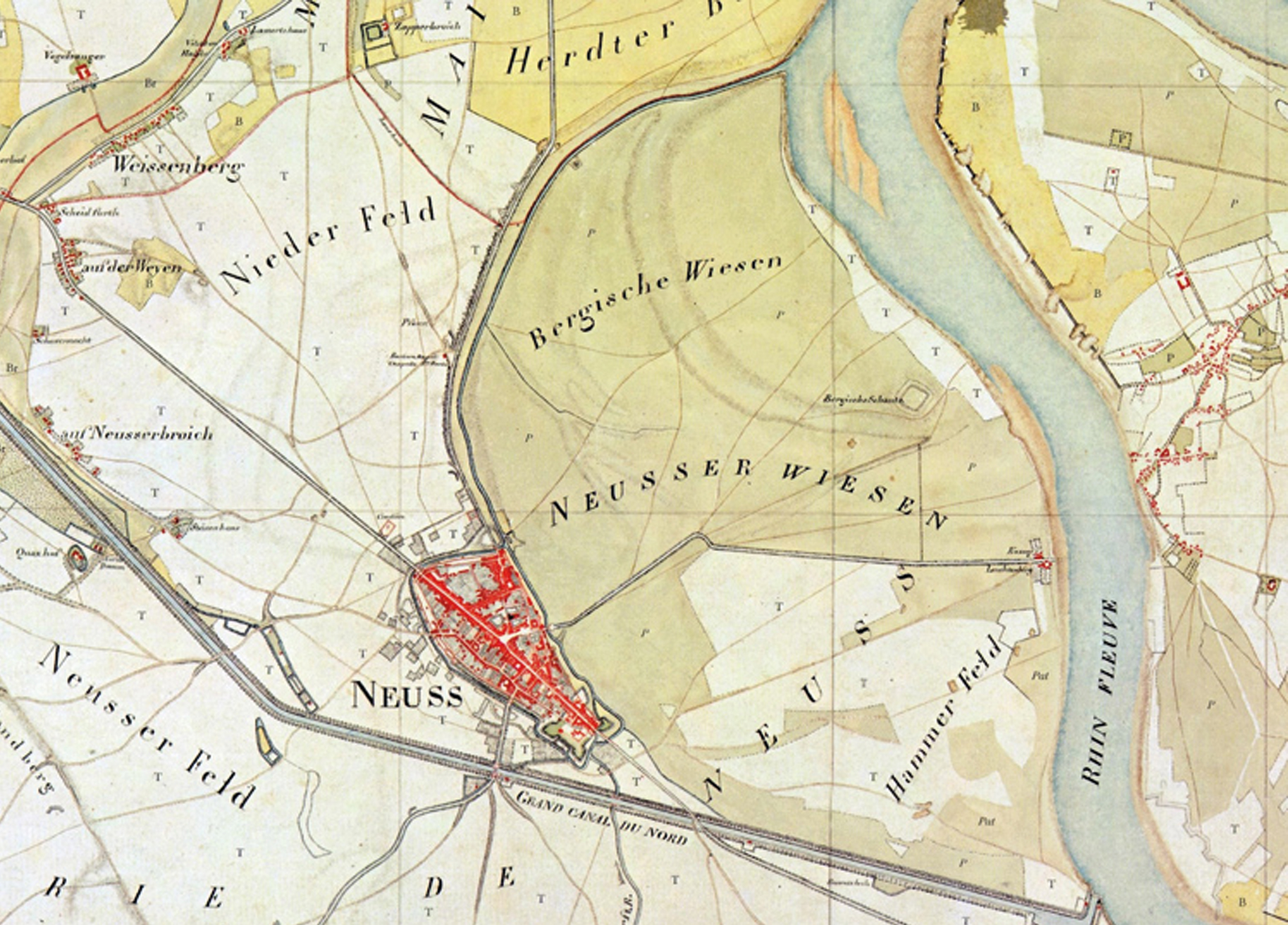 Napoleons Chefingenieur Hageau arbeitete die Trassenführung des Kanals aus. Für den längsten Teil sollte sie dem Lauf des alten Rheintals folgen, das auf langer Strecke von der Niers durchflossen wird. Die Länge des Kanals vom Rhein bis zur Maas betrug insgesamt 53 Kilometer. Häfen waren unter anderem in Süchteln und Venlo geplant. Zugbrücken sollten den Verkehr der wichtigsten Straßen über den Kanal erleichtern, Fährverbindungen waren an kleineren Straße vorgesehen. Damit der Kanal auch im Sommer immer ausreichend Wasser führt, sollte er durch Niers und Erft gespeist werden. 1807 wurden mit den Baumaßnahmen begonnen. Die Strecke begann in Neuss am Rhein und hatte bereits nach 2 Kilometern eine technische Herausforderung zu meistern: Wo heute Selikumer Straße und Nordkanalallee kreuzen, wurde 1809 eine Wasserkreuzung konstruiert. Hier sollte das Flüsschen Obererft direkt durch den Kanal gelenkt werden, und dabei genug Kraft behalten, um zahlreiche Neusser Mühlen anzutreiben. Gleichzeitig durfte dadurch im Kanal keine heftige Querströmung entstehen, da diese das Treideln (Ziehen von Schiffen auf Wasserwegen durch Mensch oder Zugtiere) gefährdet hätte.