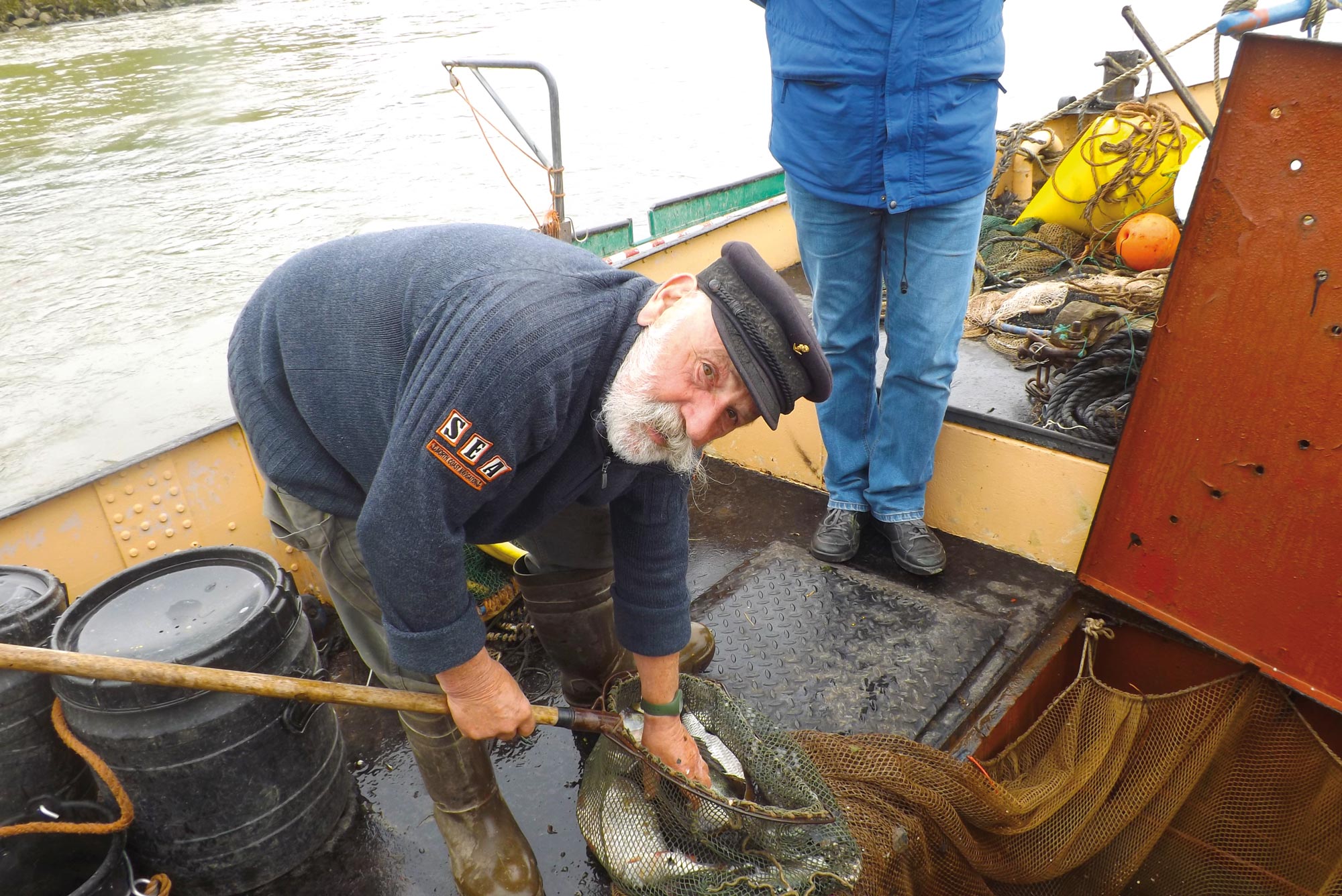 Eine frickelige Fangeinrichtung hat er für sie gebaut: Am Boot ist ein Mastbaum ins Wasser gelassen, an diesem ist ein etwa 30 Meter langes, sechs Meter tiefes Netz befestigt, das bis auf den Grund reicht. Das Netz kann er mit einer Seilwinde an Deck ziehen, um die Fische herauszuholen. Heute hat er drei Aale gefischt, außerdem sind ihm ein Lachs, eine Rotbarbe sowie zwei chinesische Wollhandkrabben und viel Treibgut ins Netz gegangen. „Die Fische sind einfach weniger geworden, weil hier sehr viele Kormorane fliegen, die uns alles wegfressen“, beschwert sich Hell, während auf der anderen Rheinseite auch schon einer dieser Wasservögel genau beobachtet, wie Rudi Hell seine Beute einholt.