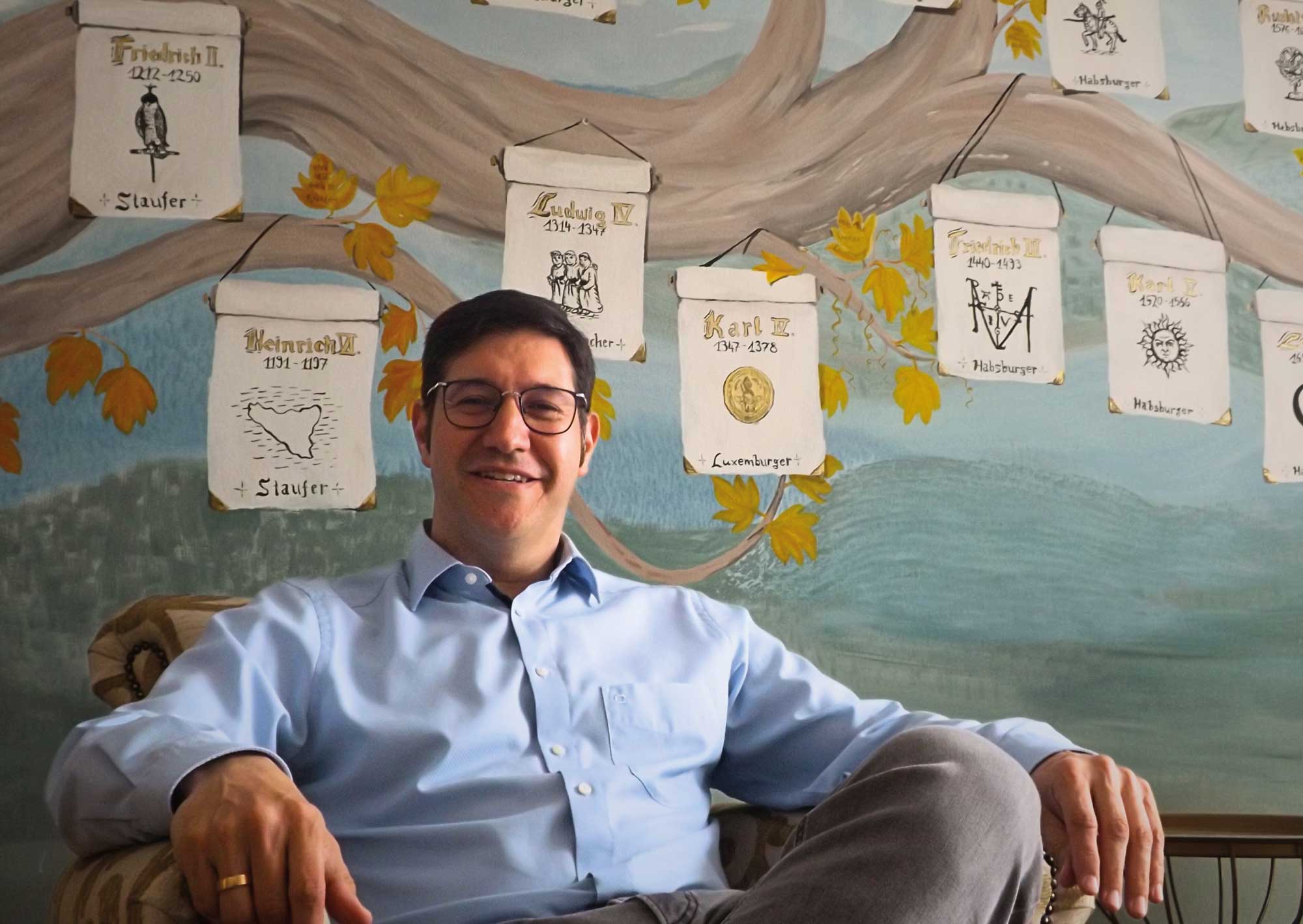 Bei all dem Stress zieht sich Jacoby zur Entspannung gerne mal in sein „Kaiserzimmer“ zurück. Alle Könige und Kaiser des Heiligen Römischen Reiches Deutscher Nation sind hier an der Wand mit ihrem Wappen wie in einem Baumdiagramm in ihren verwandtschaftlichen Be-ziehungen verbunden. „Ich habe das Wandgemälde extra von einer Berliner Künstlerin anfertigen lassen. Hier lese ich gerne mal einen historischen Roman“, sagt der 45-Jährige. „Der Name der Rose“ von Umberto Eco zählt zu seinen Lieblingsbüchern.