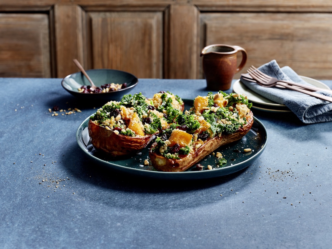 Butternusskürbis mit Grünkohl, Couscous, Cranberries