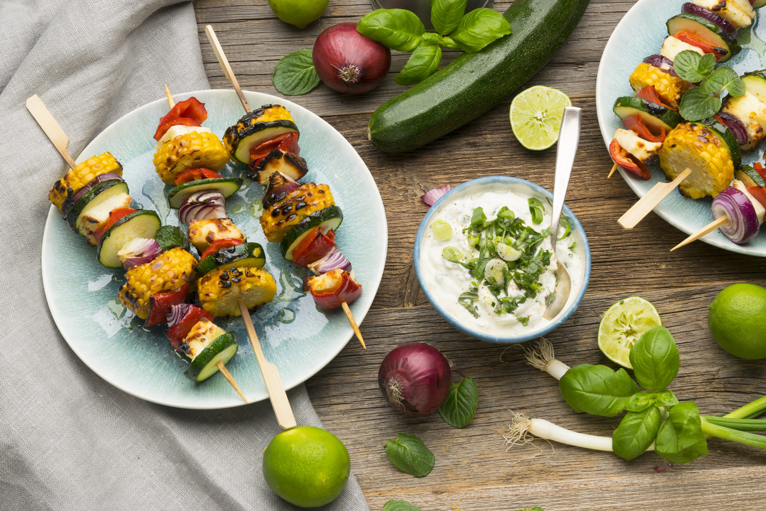 Spieße grillen bis das Gemüse gar ist. Mit etwas Olivenöl beträufeln und zusammen mit dem Kräuterdip genießen.