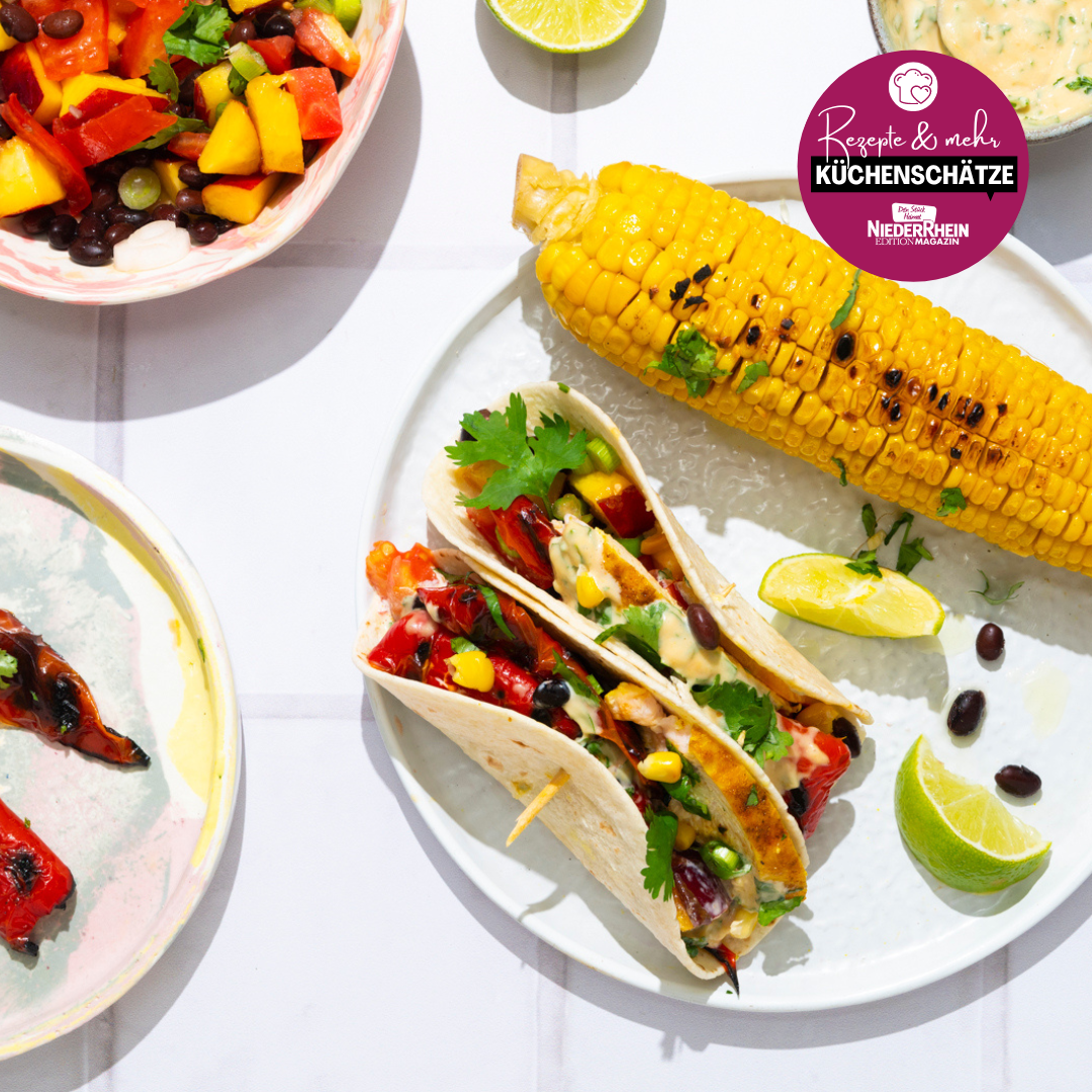 Auch wenn nach wie vor überwiegend Fleisch auf dem Grill landet, Obst und Gemüse holen auf. Was zahlreiche Restaurants, teils auf Sterneniveau, schon seit geraumer Zeit vormachen, färbt nun auch aufs Grillgut ab: Gemüse wird zunehmend als Hauptakteur in den Mittelpunkt des Gerichts gerückt. Je kreativer, desto besser! Sellerie-Steaks eingelegt in grünem Pesto, Wurzelgemüse mariniert in Olivenöl mit frischen Kräutern wie Rosmarin, Basilikum und Thymian, vegetarische Grillspieße oder auch diese südamerikanisch inspirierten Tacos, gefüllt mit Paprika-Mais-Gemüse und einer Tomaten-Nektarinen-Salsa, treiben die Geschmacksnerven in neue kulinarische Sphären! Der Fantasie sind keine Grenzen gesetzt und ungewöhnliche Kombinationen manchmal die besten!