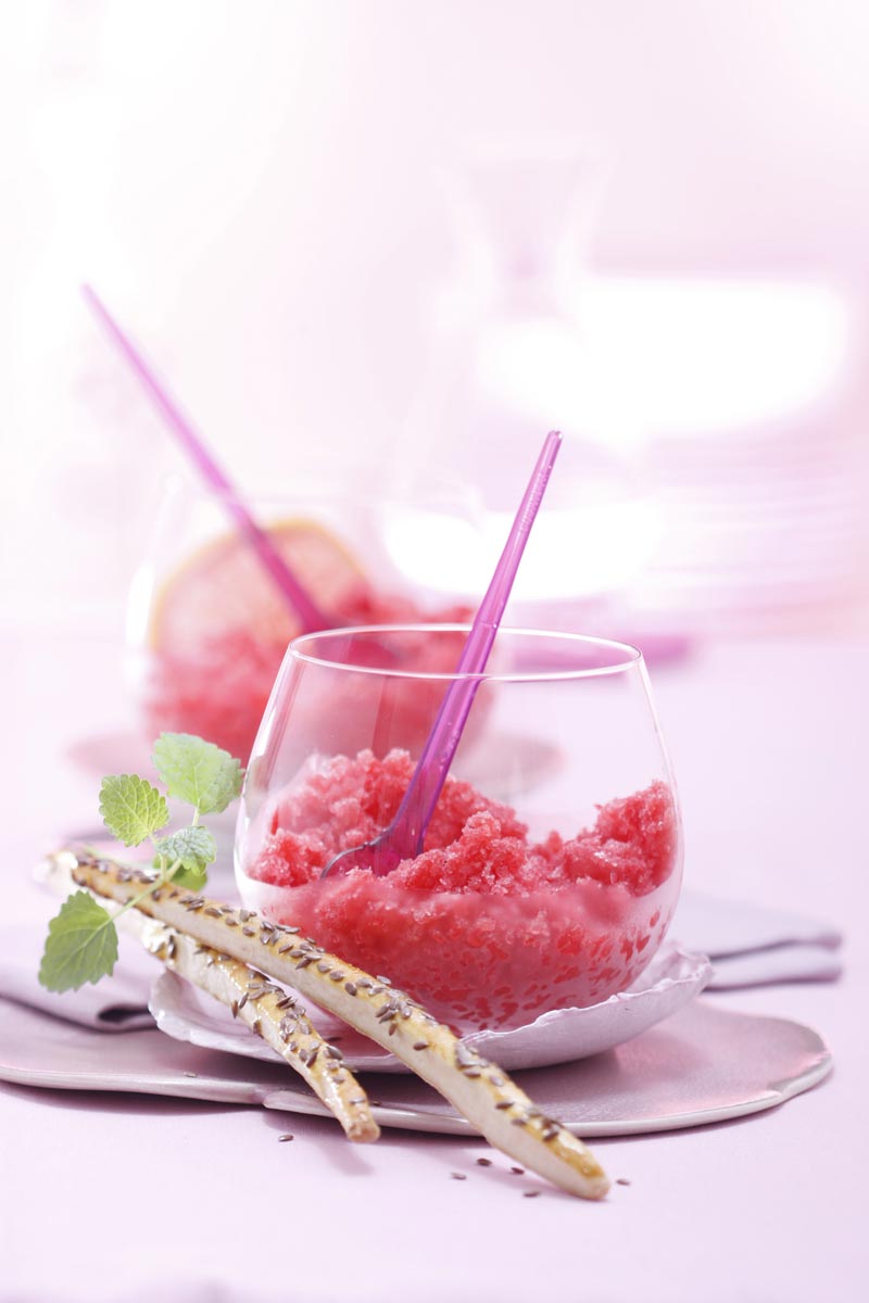 Rhabarbernektar, Zucker und Himbeeren pürieren und durch ein Sieb passieren. Alles in einer flachen Metallschale in den Tiefkühler stellen: Während des Gefrierens alle 30 Minuten mit einer Gabel umrühren, bis alles zu großen Kristallen erstarrt ist; bei -18 °C kann dies etwa 2 Stunden dauern.